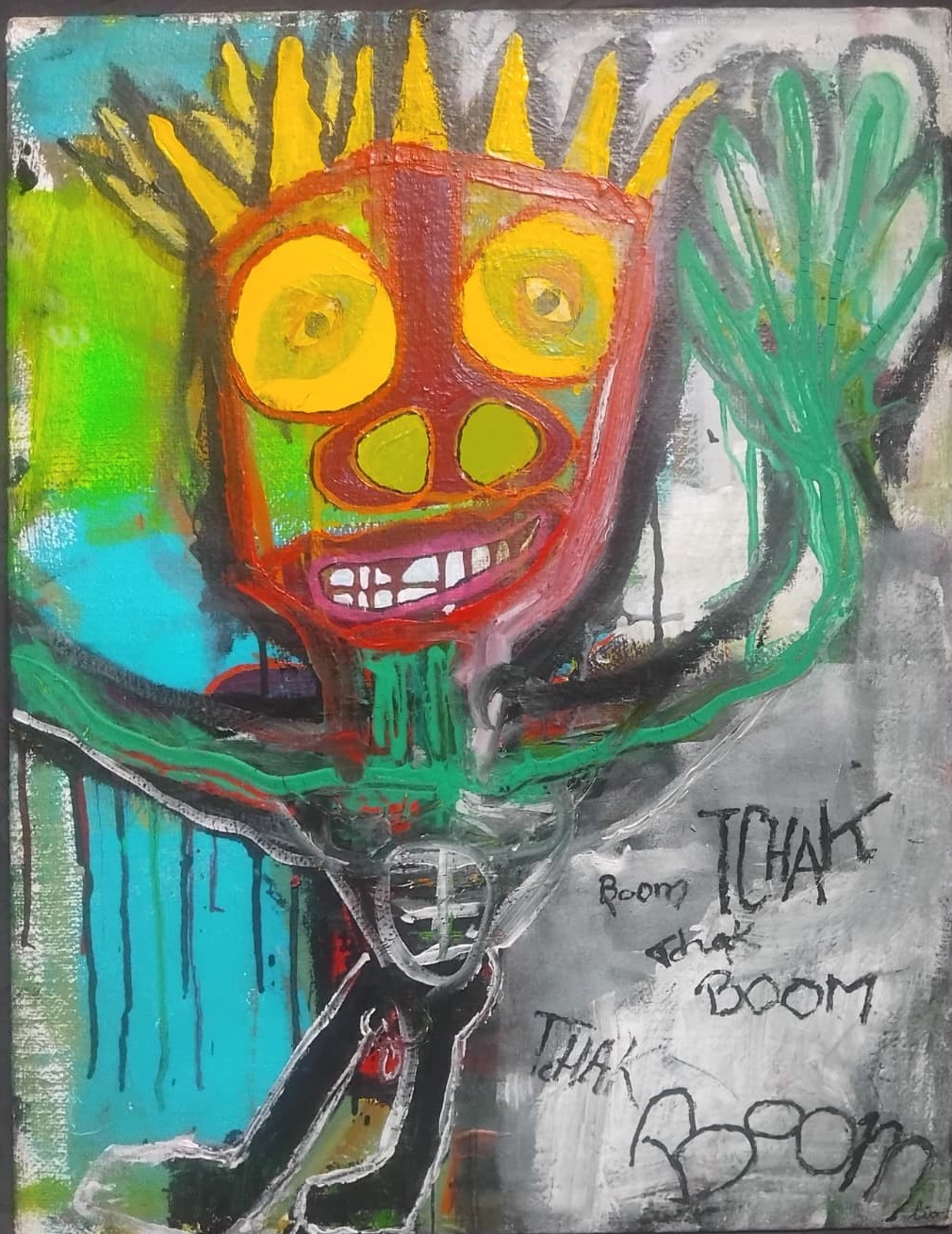 Son univers mélange l’esprit du graffiti, la naïveté assumée du dessin enfantin et l’urgence du geste. Il utilise des couleurs vives, parfois fluorescentes, et des traits volontairement imparfaits pour faire surgir des figures totémiques, animales ou humaines, qui semblent vibrer d’une force primitive.