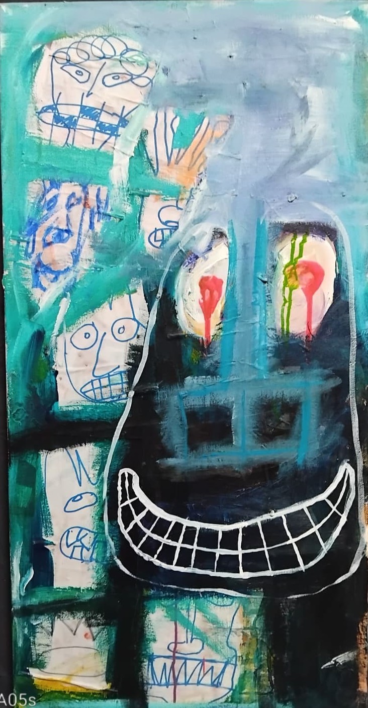 Il peint avant tout pour capturer ce qui déborde : l’émotion, le chaos, le rire, le cri. Ses tableaux sont des éclats d’instinct qui cherchent moins à représenter qu’à révéler — à laisser voir ce qui, habituellement, reste enfoui.